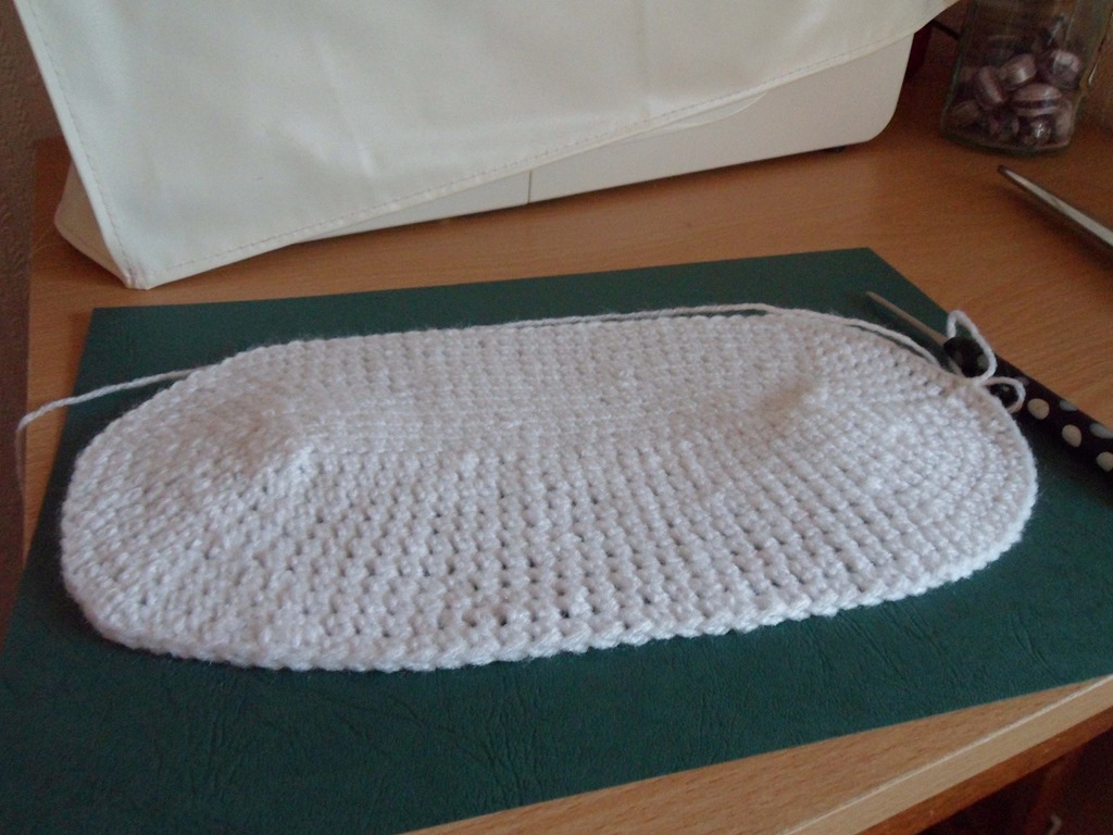 1dc in same space, 2dc in next dc, 28dc, 2dc in next dc, 1dc 2dc in next dc, slip stitch to join. Continue in rounds increasing 4 sts each round (or as many as needed to keep it flat) until it is the same size as the base.