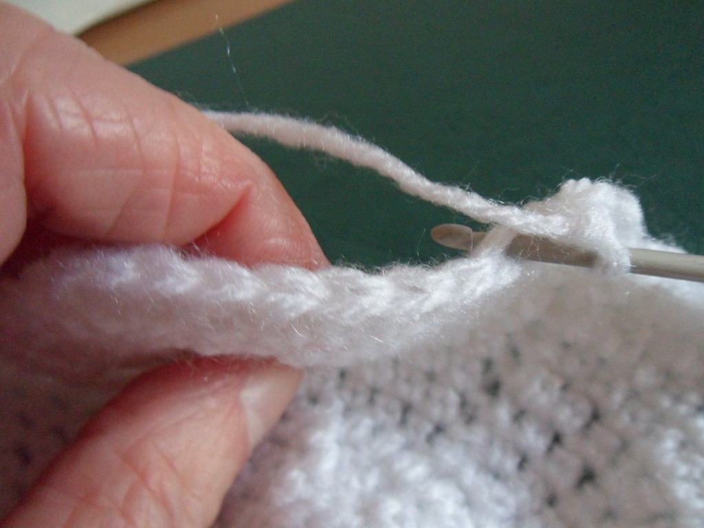 Turn the cape so the first row is at the top and join your yarn, we'll work the next row in the same chains we started with.