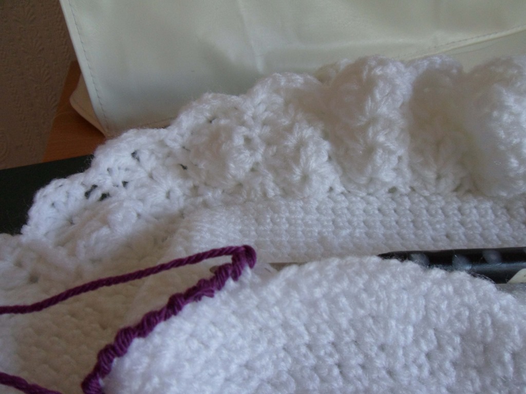 3 chain and 1tr 1ch, 2tr . Into front loop of previous row dc, miss 1dc 1slip st into next dc, miss 1dc,* 2tr, 1ch, 2tr* in next dc, (*shell) work shell frill for 2 1/2”
